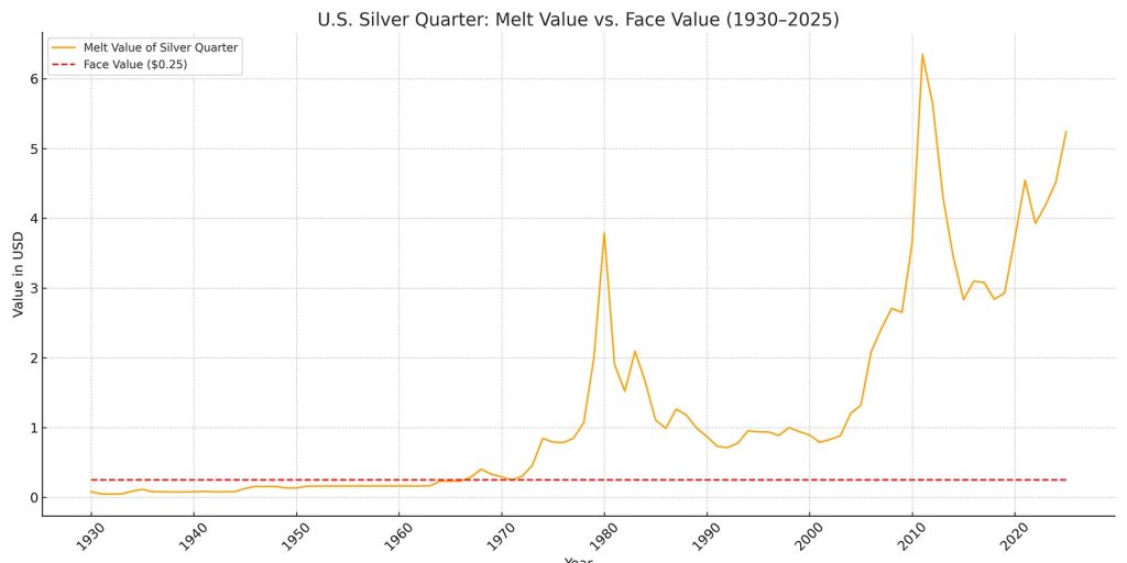 For much of U.S. history, real silver was part of everyday life. From the 1930s through 1964, the U.S. Mint produced quarters made of 90% silver—durable, valuable, and sound. But take a look at the chart below which shows the actual melt value of a silver quarter based on silver’s spot price from 1930 through 1964 compared to the face value of the common U.S. Silver Quarter with face value of $0.25.